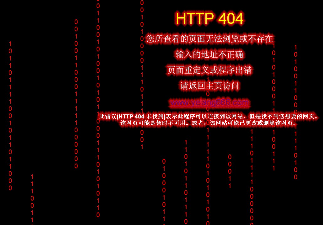 這個是動態(tài)的,1010字符串,看上去很唬人的樣子。比較適合做科技型的、黑客社區(qū)等方面的404頁面??瓷先ビ悬c炫!