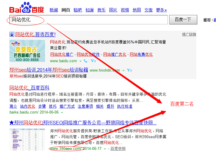 最近百度調(diào)整,我們的網(wǎng)站關(guān)鍵詞中“網(wǎng)站優(yōu)化”百度排名第二,第一名是百度百科,有圖有真相: