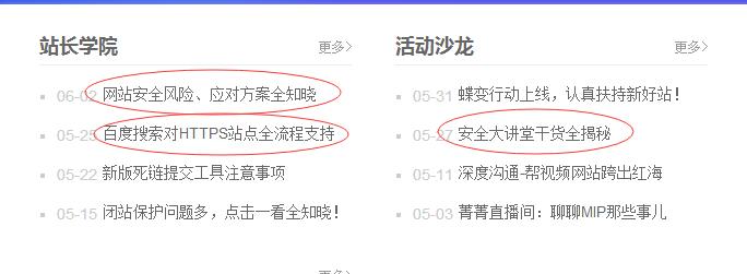 下圖是野狼在百度站長平臺上截取的近日兩個板塊的8篇文章,3篇就是說安全的,可見百度有多重視網(wǎng)站安全問題: