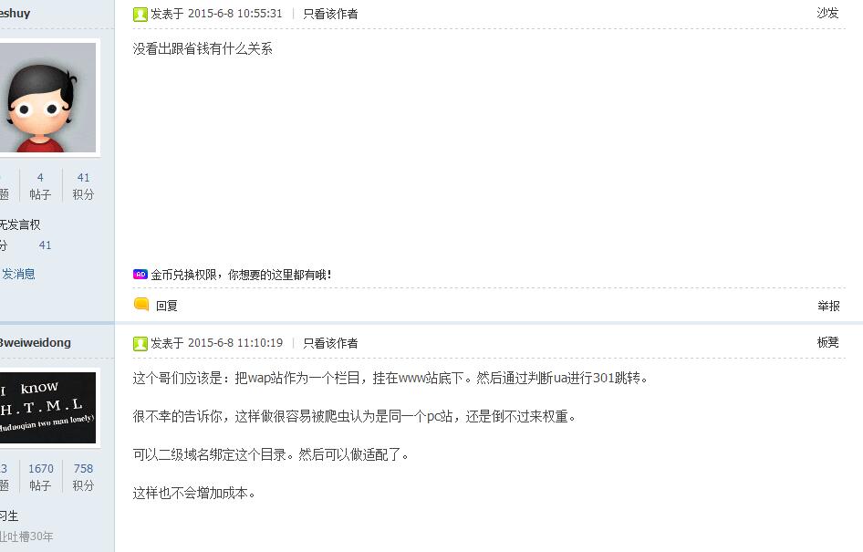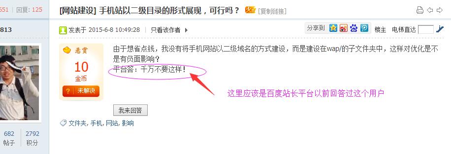 不知道這個(gè)回答是從哪里來的,但確實(shí)是百度的態(tài)度,他已經(jīng)明確表示不支持二級(jí)目錄下的手機(jī)網(wǎng)站。這個(gè)我們都知道,但是看了后邊的帖子,野狼就忍不住想笑。