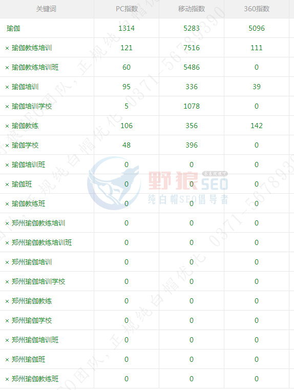 因為有很多詞,指數情況都不高,所以野狼SEO并沒有詳細去查詢,例如瑜伽培訓學院、瑜伽培訓基地等等這些都是沒有指數的: