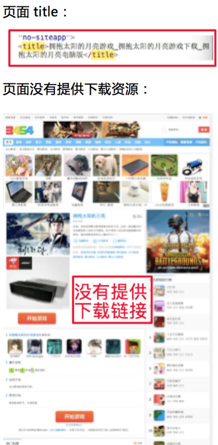 示例(2):網(wǎng)站頁面標(biāo)題說明中有游戲下載、APP下載等下載資源,但實際用戶點擊下載后,直接跳轉(zhuǎn)到其他站點。