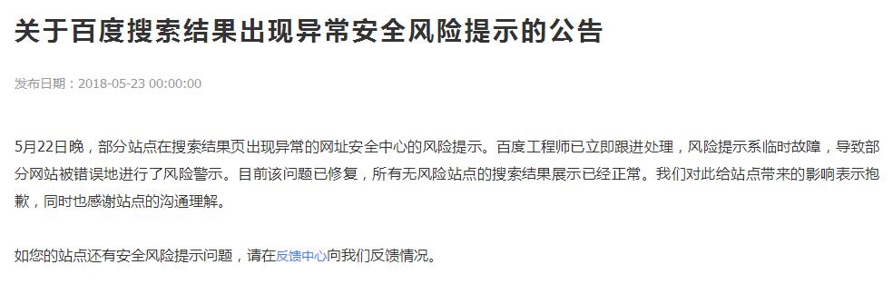 5月22日晚,部分站點(diǎn)在搜索結(jié)果頁出現(xiàn)異常的網(wǎng)址安全中心的風(fēng)險(xiǎn)提示。百度工程師已立即跟進(jìn)處理,風(fēng)險(xiǎn)提示系臨時(shí)故障,導(dǎo)致部分網(wǎng)站被錯(cuò)誤地進(jìn)行了風(fēng)險(xiǎn)警示。目前該問題已修復(fù),所有無風(fēng)險(xiǎn)站點(diǎn)的搜索結(jié)果展示已經(jīng)正常。我們對此給站點(diǎn)帶來的影響表示抱歉,同時(shí)也感謝站點(diǎn)的溝通理解。
