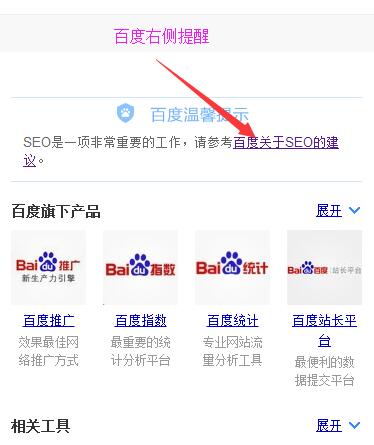 熟悉百度的人可能都知道,在輸入SEO相關(guān)的詞匯,右側(cè)會出現(xiàn)一個提示:“SEO是一項非常重要的工作,請參考百度關(guān)于SEO的建議”。