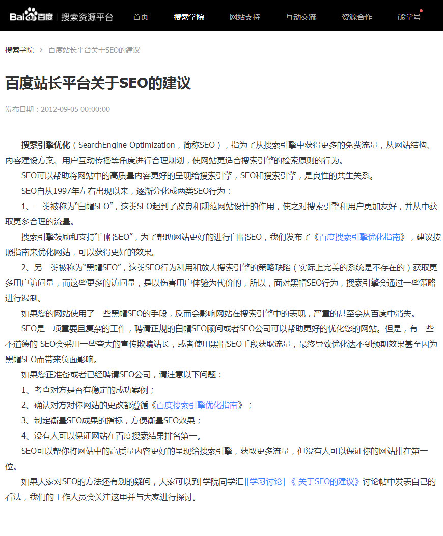 上面的公告也是2012年的,從這一年百度開始做百度站長平臺,開始發(fā)布自己的算法動向,開始指導(dǎo)大家給網(wǎng)站做SEO。