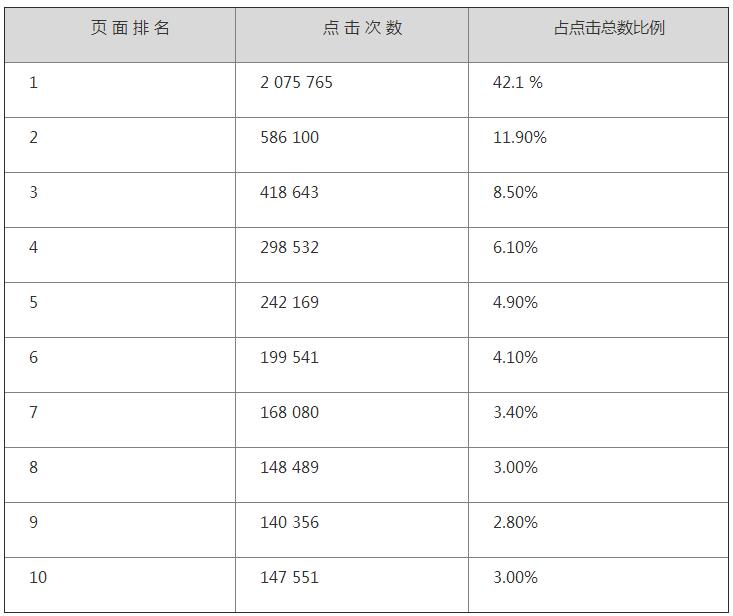 2、排名首頁并不是網(wǎng)站最終的歸宿,因為排名提升一點,點擊量可能會好很多。第10名和第1名,點擊率相差10倍。