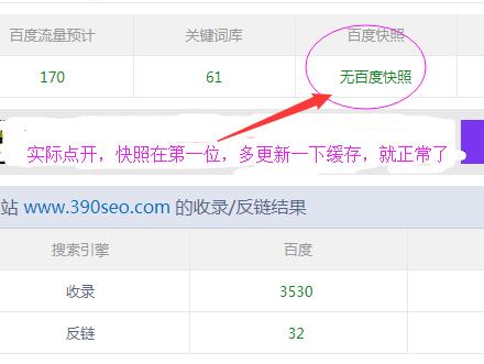 我們看到這里顯示“無百度快照”,很多人就有些著急,實際上你點開看,是有的,而且網(wǎng)站排名等各項指標(biāo)也都是正常的。所以還是工具的問題,而不是網(wǎng)站問題。這樣的情況多的很。
