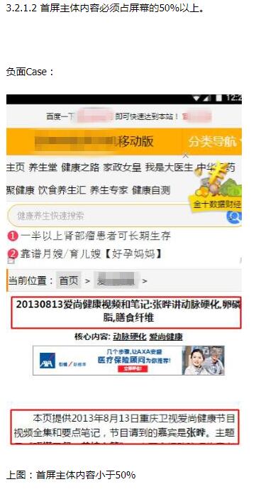 很多做網(wǎng)站的可能并不關(guān)注一些SEO的要求,比如百度這兩年發(fā)布的有移動(dòng)網(wǎng)站優(yōu)化白皮書(shū),里邊有一些硬性的條條框框,你稍不注意就可能做出來(lái)的網(wǎng)站搜索引擎不喜歡,比如百度要去的,主題內(nèi)容要占屏幕的50%以上,有的網(wǎng)站可能就沒(méi)有做到,比如百度資源平臺(tái)上專(zhuān)門(mén)指出的這個(gè)問(wèn)題,截圖如下:
