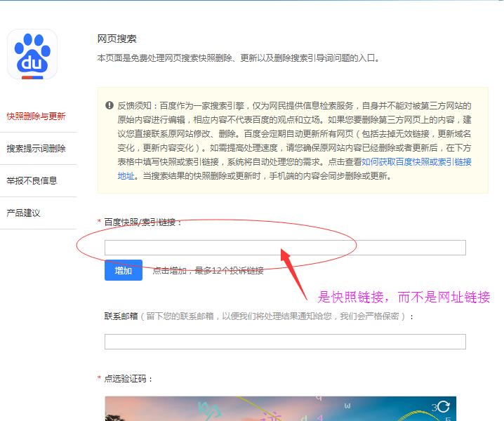 上邊截圖的刪除快照的網(wǎng)址是:http://tousu.baidu.com/webmaster/add