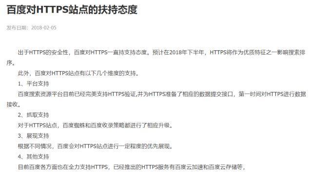 但,對(duì)于HTTPS站點(diǎn)的扶持態(tài)度來(lái)講,百度是支持的,而且在2018年專門發(fā)過(guò)一個(gè)公告在平臺(tái)支持、抓取支持、展現(xiàn)支持等方面都有全方位的支持。相信對(duì)于還沒(méi)有做改造的網(wǎng)站,會(huì)有比較大的影響,這也是最近總是有人找野狼做HTTPS的原因。