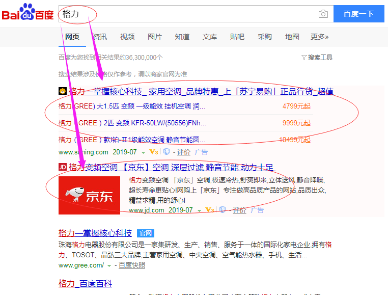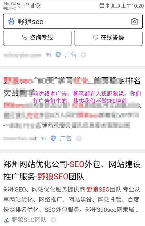 比如,你搜索格力,會(huì)出現(xiàn)“蘇寧”、“京東”的廣告。這還不算什么,更氣人的是,你自己的品牌,也會(huì)被人層熱度。比如說(shuō),野狼SEO,你搜索的時(shí)候會(huì)出現(xiàn)非常多的廣告: