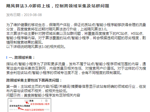 5個(gè)月了,百度幾乎沒有發(fā)布過任何新算法公告,這次主要針對(duì)大家反映比較多的小程序占用太多搜索流量問題,進(jìn)行了颶風(fēng)算法3.0