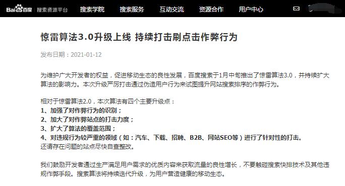 驚雷算法就是專門針對作弊進行打擊的,刷點擊的作弊行為,是驚雷3.0的重點打擊對象。這是2021-01-12日發(fā)布的公告,要“持續(xù)”、“打擊”、“刷點擊作弊行為”: