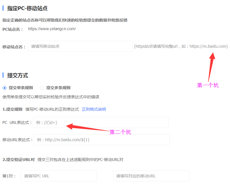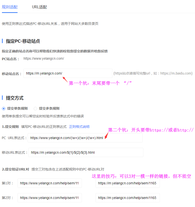 另外,還附送了一個(gè)技巧,就是提交首頁的時(shí)候,你可能沒有辦法提交3個(gè)首頁,但他就是非讓你寫3個(gè),因?yàn)閷?個(gè)是不行的,報(bào)錯(cuò)!于是技巧來了,你可以寫3遍“https://www.yelangcn.com/ https://m.yelangcn.com/” 這樣的URL對(duì),于是就成功了: