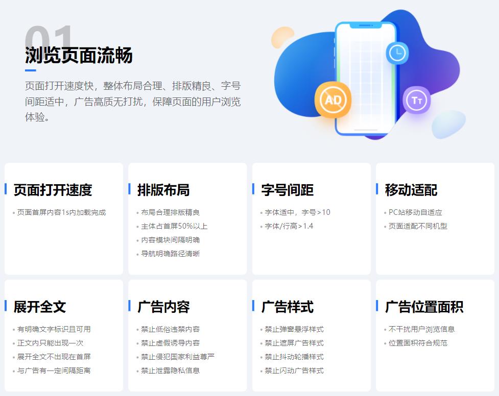 這是百度站長資源平臺的專題中,關于移動搜索落地頁的要求,第一條就講到了瀏覽頁面順暢的要求:頁面打開速度快,整體布局合理、排版精良、字號間距適中,廣告高質無打擾,保障頁面的用戶瀏覽體驗。