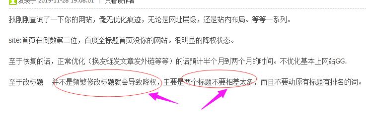 有網(wǎng)友發(fā)帖問(wèn):網(wǎng)站標(biāo)題修改之后,排名直接找不到了,問(wèn)怎么樣恢復(fù)。于是我們看到一些回復(fù),有一個(gè)是這樣回復(fù)的,相對(duì)比較全面一些: