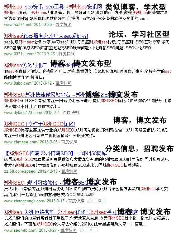 3、搜索“鄭州SEO”展現(xiàn)的幾乎都是博客等學(xué)術(shù)交流性非商業(yè)性質(zhì)的網(wǎng)站。