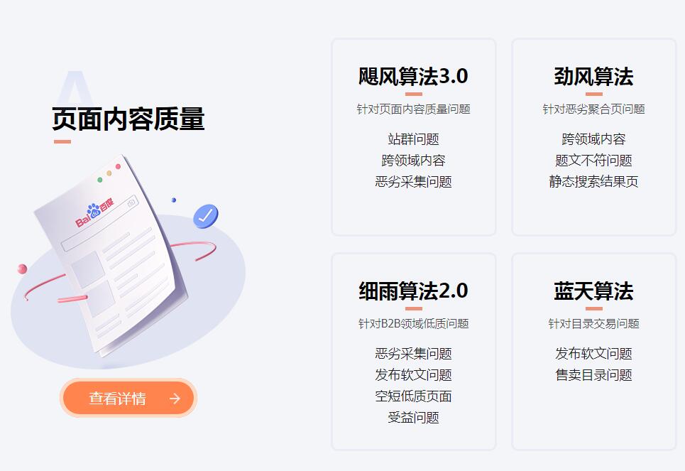 總共是四大類,每一個類別里邊百度總結(jié)出來一些算法名字,還有一些并沒有總結(jié)成名字。這就說明搜索引擎的算法整體上是有計劃性的,而且對于很多方面的改進(jìn)是有規(guī)劃,但這些并不是算法的全部,有非常多的細(xì)小的算法并沒有系統(tǒng)的給大家介紹,還需要自己去猜。