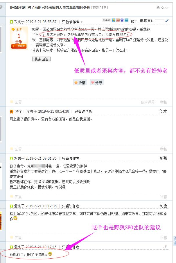 最近看到一個(gè)提問(wèn):“網(wǎng)站已經(jīng)采集有大量文章,應(yīng)該如何處理?”這個(gè)問(wèn)題,估計(jì)很多作弊的人都會(huì)遇到。有的是通過(guò)一些其他作弊手段,發(fā)現(xiàn)網(wǎng)站出問(wèn)題了,才想到補(bǔ)救辦法。野狼SEO團(tuán)隊(duì)的建議是: