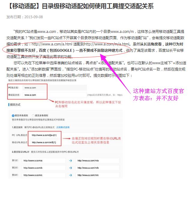 而不好的適配方式是:1、響應(yīng)式 2、手機(jī)站放在二級(jí)目錄。因?yàn)槲覈?guó)存在大量的純靜態(tài)生成的網(wǎng)站,而且有非常多的賣模板的人是做這種網(wǎng)站出身,所以做手機(jī)網(wǎng)站的時(shí)候就用二級(jí)目錄來(lái)做,非常的不好。大家可以看百度發(fā)布的公告: