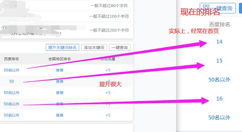可以說把3個主要的50名外的關(guān)鍵詞做到十幾名,已經(jīng)是非常不錯的成績。但實際上,這個是站長SEO平臺的顯示,真正的排名還要比這個好得多。一個月有一半多的時間,這三個詞是排名首頁的。