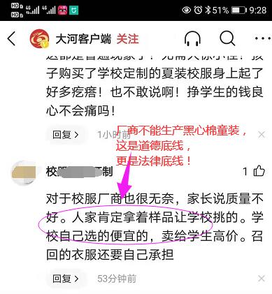 就像今天早上我們看到的一個小學(xué)黑心棉校服一樣,因為是“校長的親戚”,整個學(xué)校都買了。發(fā)給學(xué)生發(fā)現(xiàn)不對勁兒,面料粗糙,內(nèi)含“黑心棉”。這不客氣,氣人的是看到了一個校服定制人發(fā)的評論:廠商也很無奈……