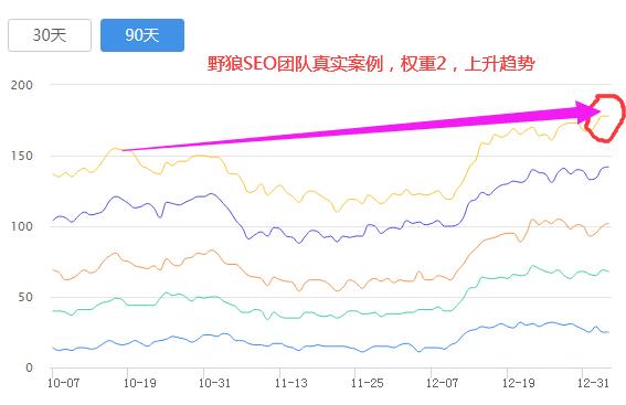 但如果是要去看長周期,也會(huì)看到有時(shí)候出現(xiàn)一些略微大型的波動(dòng),但你會(huì)發(fā)現(xiàn),從波峰來看,他是上升趨勢(shì)的。如果是再長一點(diǎn)周期,你會(huì)看到他從當(dāng)初的一點(diǎn)排名沒有,精力波折,最后變成一百多個(gè)關(guān)鍵詞排名靠前: