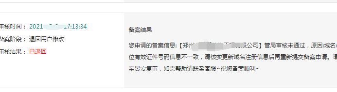 您申請(qǐng)的備案信息:【xxxx有限公司】管局審核未通過,原因:域名***注冊(cè)人證件號(hào)碼信息與備案單位有效證件號(hào)碼信息不一致,請(qǐng)核實(shí)更新域名注冊(cè)信息后再重新提交備案申請(qǐng)。請(qǐng)您盡快按照退回的審核意見進(jìn)行修改之后提交至景安復(fù)審,如需幫助請(qǐng)聯(lián)系客服~祝您備案順利~