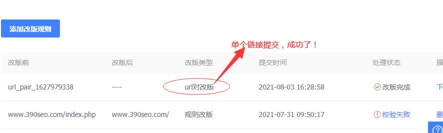 于是,接下來的操作就是提交一個鏈接對,過了兩天一看,成功了!百度的工具可能覺得你選擇了“規(guī)則改版”就應(yīng)該表達式里有規(guī)則,不能沒有正則表達式,這樣的理解也是讓人醉了。