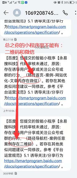 百度智能小程序,為的就是給H5網(wǎng)站數(shù)據(jù)打通,但有一個難題是:審核時候比較難。因?yàn)楹芏辔恼吕镞叢豢赡芪⑿藕投S碼都沒有吧?一旦有了,他就審核不通過。甚至我們做的客戶案例的網(wǎng)站截圖上有二維碼也不行。真的是醉了: