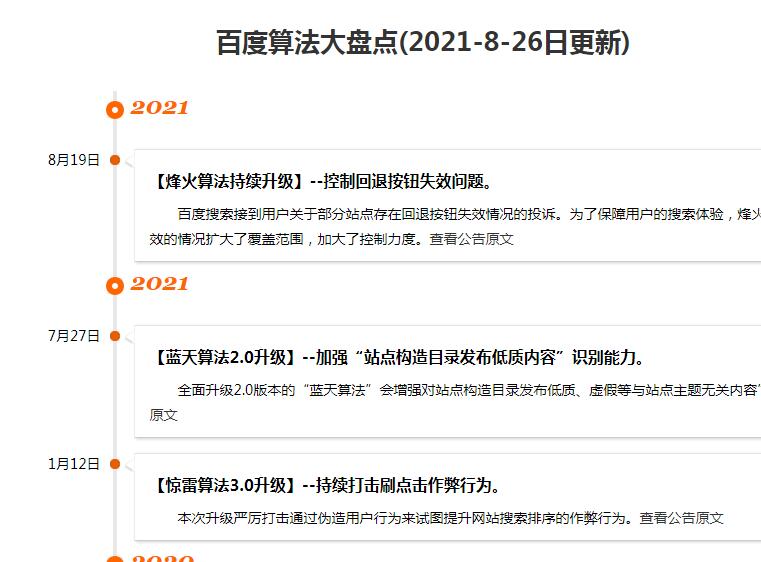 截止到目前(2021年8月26日),百度今年只要進行了3次大的算法升級,主要是驚雷算法、藍天算法、烽火算法。升級了3個方面:1、點擊作弊 2、內(nèi)容質量 3、回退按鈕。