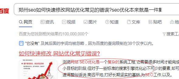 這句話還挺長的:“鄭州seo如何快速修改網(wǎng)站優(yōu)化常見的錯誤?seo優(yōu)化本來就是一件復(fù)雜而又繁瑣的事情,它沒有任何固定的樣式和規(guī)律;它需要花費(fèi)大量的時(shí)間,才能夠完成一個階段的小目標(biāo),我們大多數(shù)的網(wǎng)站優(yōu)化者都是依靠自己的經(jīng)驗(yàn)去實(shí)踐,那么難免會碰到一些問題,但對一些標(biāo)準(zhǔn)性的搜索引擎優(yōu)化”,只是到了百度搜索引擎那里,被截取了部分,成為“鄭州seo如何快速修改網(wǎng)站優(yōu)化常見的錯誤?seo優(yōu)化本來就是一件復(fù)雜而又繁瑣的事情,”