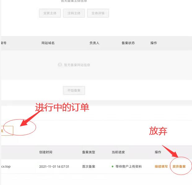有的是嘗試性的驗證一下備案服務號,再次提交的時候就出現(xiàn)上述提示。這個時候不用慌,取消掉原來的訂單,備案服務號就恢復可用狀態(tài)了。