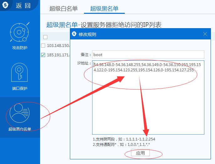 在安全狗上找“網(wǎng)絡(luò)防火墻>超級(jí)黑名單”,添加IP組進(jìn)去,保存即可。如下圖所示: