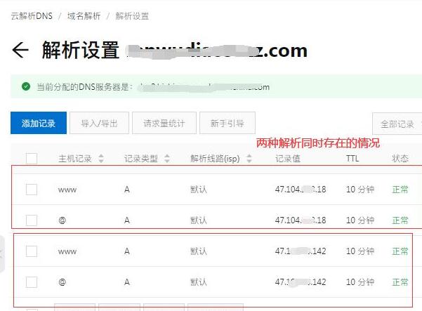 于是檢查了域名的解析情況,發(fā)現(xiàn)本來只需要2條記錄的,變成了4條,重復(fù)了: