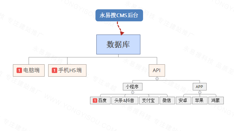 以永易搜cms為例,后臺管理數(shù)據(jù)庫等,數(shù)據(jù)庫可以與網(wǎng)站和API對接。而API與小程序、APP數(shù)據(jù)互通,如下圖所示: