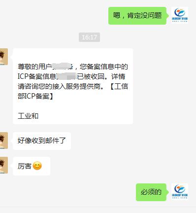 下午通知他備案已經(jīng)取消,客戶還有的不相信。不一會(huì)兒的功夫自己收到了郵件,才確定這是真的。可以說(shuō)術(shù)業(yè)有專(zhuān)攻,大家把自己的時(shí)間節(jié)省下來(lái),白菜價(jià)格讓我們代為處理網(wǎng)站備案事宜,高效,不耽誤事兒!微信:13526646200