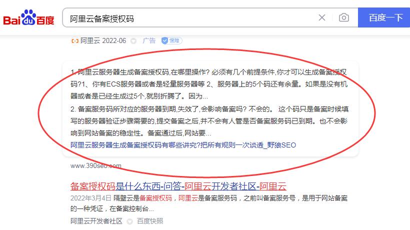 在百度的搜索結(jié)果頁面里,有一個大面積的內(nèi)容解釋,一般是對于一些知識類的,疑問性質(zhì)的東西,進(jìn)行的解釋。比如野狼SEO團(tuán)隊的很多頁面,搜索的時候都會出現(xiàn)這樣的結(jié)果: