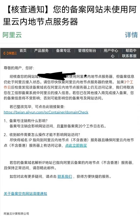 比如,阿里云就經(jīng)常發(fā)這樣的通知:【核查通知】你的備案網(wǎng)站未使用阿里云內(nèi)地節(jié)點(diǎn)服務(wù)器,如下圖所示: