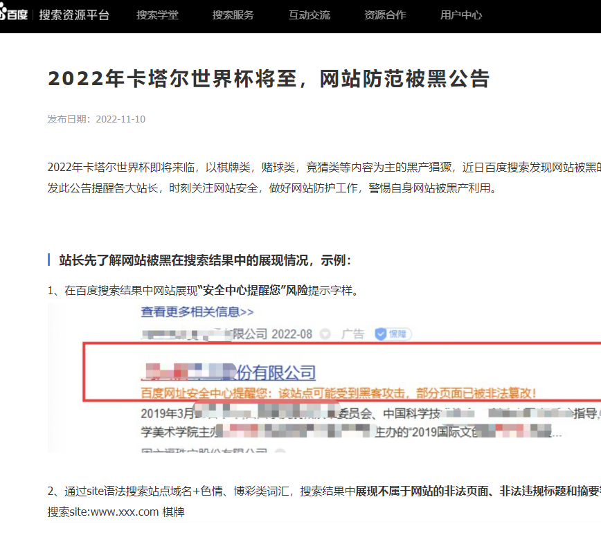 每到春節(jié),都會(huì)有很多人的網(wǎng)站被黑,造成不可挽回的損失。今年世界杯期間就有很多網(wǎng)站遭殃,造成排名很長(zhǎng)時(shí)間都不會(huì)有好轉(zhuǎn),所以一定要注意。而且搜索引擎也是很關(guān)注網(wǎng)站安全的,對(duì)于網(wǎng)站安全防護(hù)不好的,也會(huì)給比較重的處罰。這是百度站長(zhǎng)資源平臺(tái)在世界杯期間發(fā)布的公告: