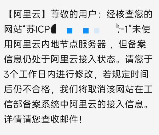 [阿里云]尊敬的用戶:經(jīng)核查您的網(wǎng)站“蘇ICPxxxxxx-1”未使用阿里云內(nèi)地節(jié)點(diǎn)服務(wù)器,但備案信息仍處于阿里云接入狀態(tài)。請(qǐng)您于3個(gè)工作日內(nèi)進(jìn)行修改,若規(guī)定時(shí)間后仍不合格,我們將取消該網(wǎng)站在工信部備案系統(tǒng)中阿里云的接入信息。詳情請(qǐng)您查收郵件!