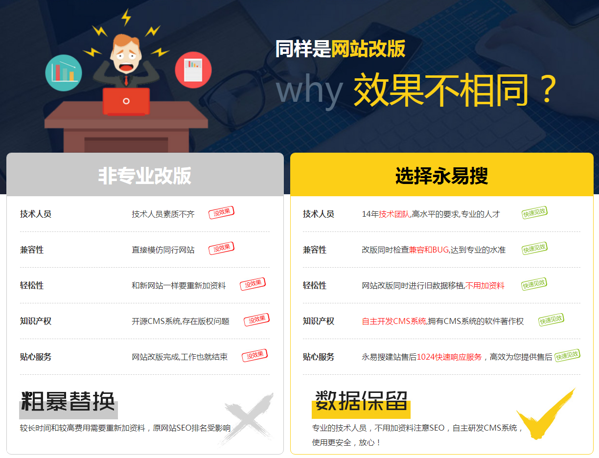 很多人換網(wǎng)站后臺的時候,會擔心影響到原來網(wǎng)站的排名,這個是很大的問題,客戶自然會考慮更充分一些。剛好我們SEO業(yè)務和網(wǎng)站建設業(yè)務做的都比較好,尤其是結(jié)合得比較好。做的有專門給老網(wǎng)站改版的業(yè)務,其中對于老網(wǎng)站內(nèi)容的保留,就是建站中很特色的一個服務。