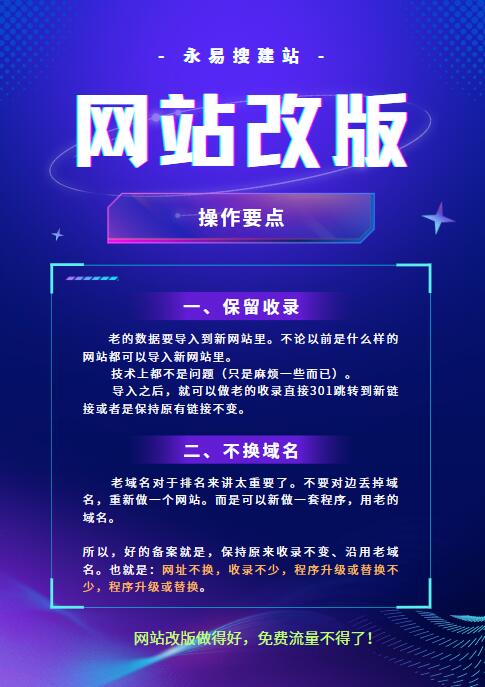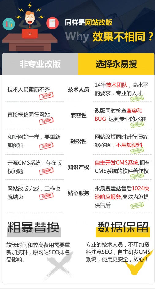 網(wǎng)站改版,要相信專業(yè)的力量。永易搜建站、野狼SEO團(tuán)隊(duì),十幾年經(jīng)驗(yàn)為您保駕護(hù)航。