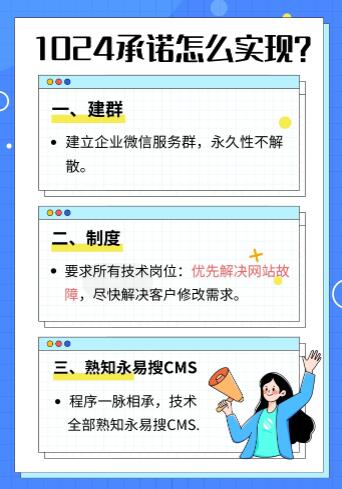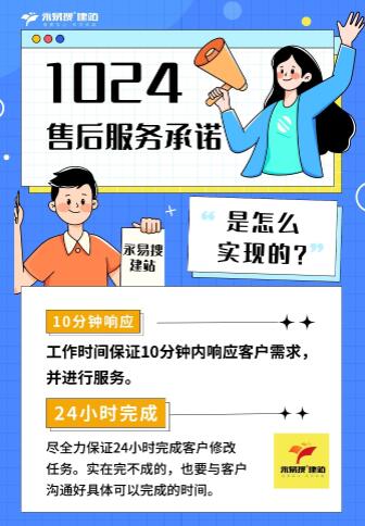 永易搜建站再2019年提出了網(wǎng)站建設(shè)1024售后服務(wù)承諾,這不只是一句承諾,是要真正的落地實(shí)施的。那么我們是怎么實(shí)現(xiàn)的呢?