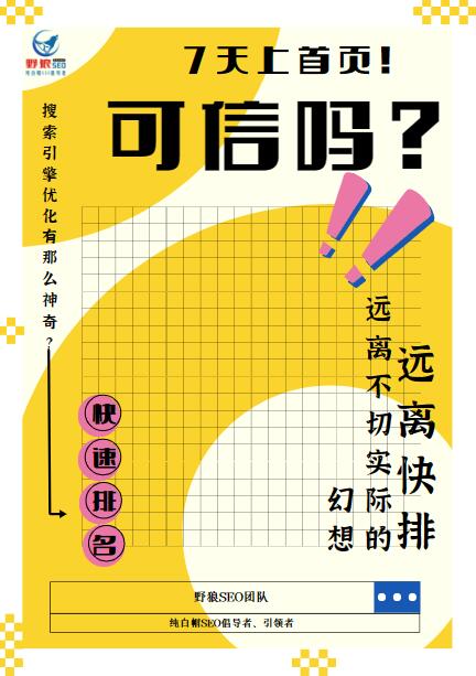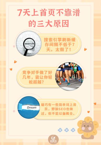 有人會問野狼,很多廣告上寫:7天上首頁,這可信嗎?這種事情,既然大家有疑問,就說明是不信的。而確實,這種東西只是一句不負(fù)責(zé)任的廣告詞而已,吸引眼球用的,完全不用相信。