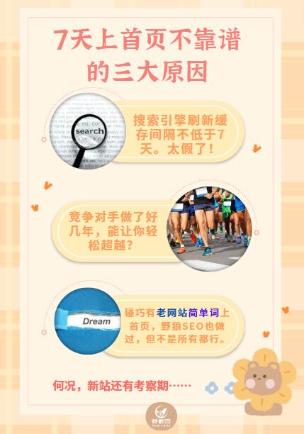 具體點來說,7天上首頁,只是一個夢。因為對于99.999%的網(wǎng)站,都不適合。因為這種情況是很極端的,以前還容易實現(xiàn)一些,現(xiàn)在幾乎是不可能的。有多方面的原因: