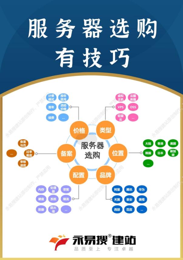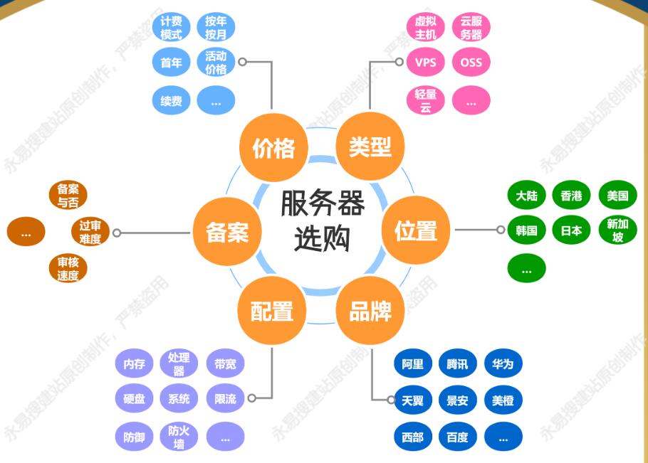 想要選擇合適自己的,好用的服務(wù)器,一定要知道服務(wù)器有哪些種類,有哪一些服務(wù)器更好一些。我們從服務(wù)器:類型、位置、品牌、配置、備案、價(jià)格等6個(gè)方面進(jìn)行了總結(jié),如下圖所示: