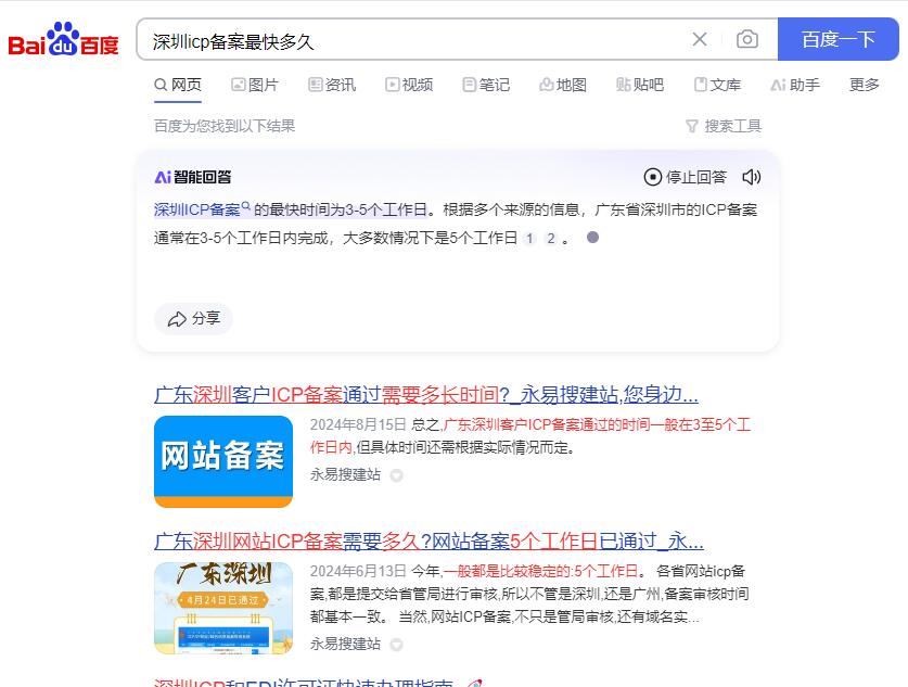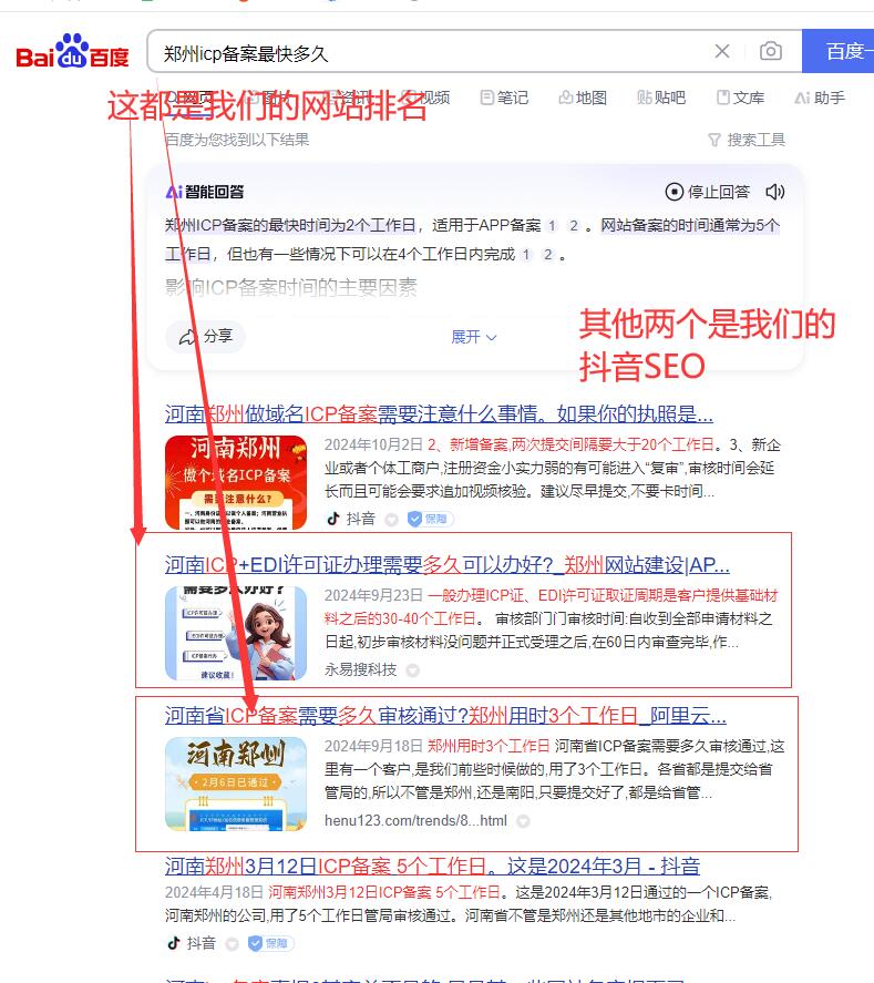 你比如,我們給詞,換成“深圳”,這樣就是“深圳icp備案最快多久”,結(jié)果也是很好的。前3名輕松搞定!后邊也是大部分都是我們的信息。