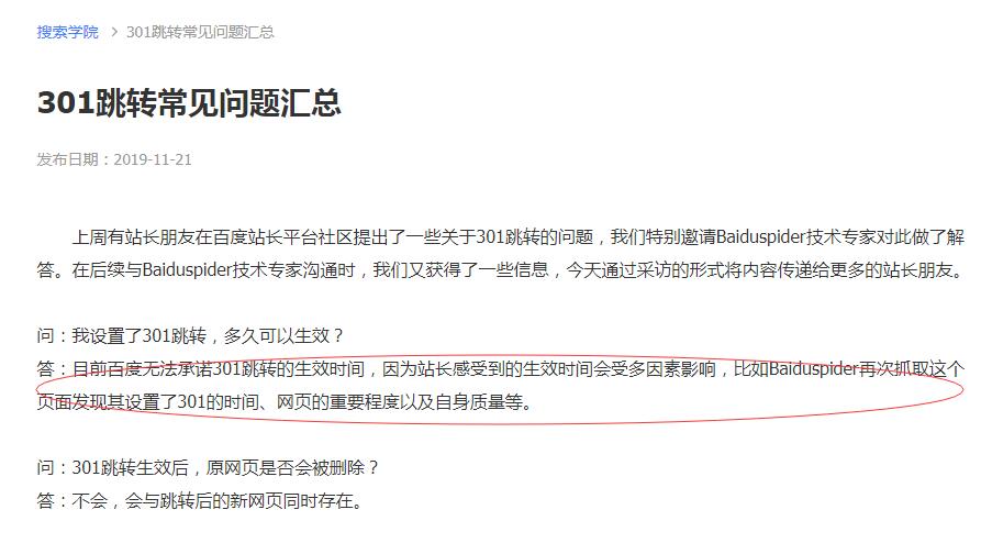 很多人設(shè)置了301跳轉(zhuǎn),也做了百度資源平臺(tái)上的改版規(guī)則,但就是很長(zhǎng)時(shí)間都沒有生效。于是就想找“301的生效時(shí)間”。我們也經(jīng)常給大家說,這個(gè)時(shí)間并不確定。