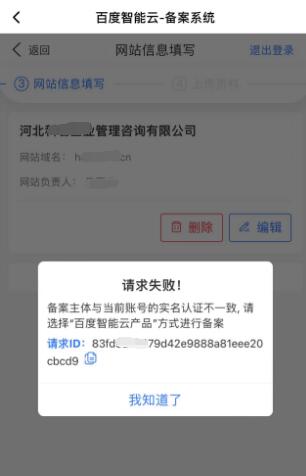 請求失?。浒钢黧w與當前賬號的實名認證不一致,請選擇“百度智能云產(chǎn)品”方式進行備案。